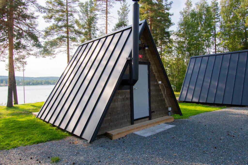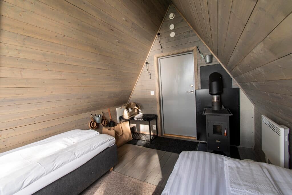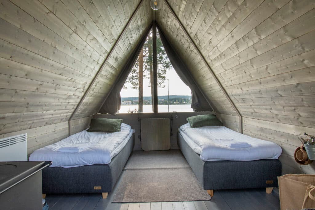 Brand new accommodation at Ansia! Welcome to Vildmarksbyn – a truly unique stay resembling a hut, a mix between a cabin and glamping. Here, you’ll stay in 8.5 cozy square meters with a magical view of the river just outside the window. There are two beds and a wood-burning stove for extra coziness. You can also choose to rearrange the beds to make them into a double – see floor plan. The cabin includes two cups, two food bowls, cutlery, and hooks. Firewood, bed linen, towels, and departure cleaning are included when you book these cabins. A perfect choice for a small group looking for a truly unique experience. Next to Vildmarksbyn, there is also a grill hut available for rent where you can prepare your evening meal. Please note that there is electricity in Vildmarksbyn, but no running water.