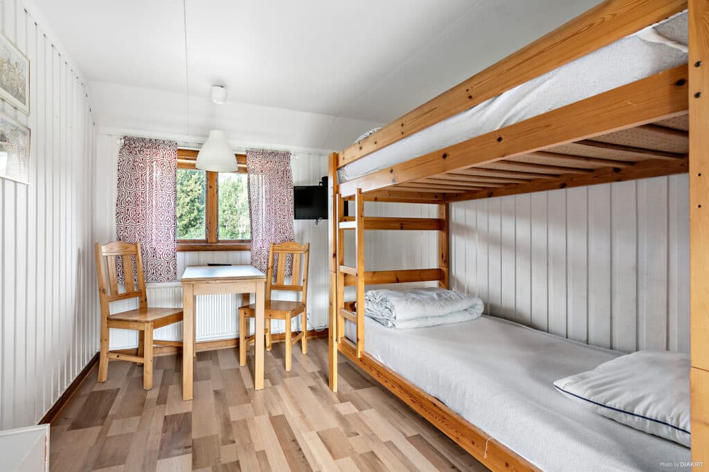 Vandrarhemmet Loftet rooms for two people are 8 m2. Number 35 B-C is downstairs and number 35 E-F is upstairs. The room features a bunk bed, TV, and a kitchenette with a hotplate, microwave oven, and a coffee maker. The room does not feature running water, a toilet or shower, except in the building that you share with other guests. Bring your own detergent for cleaning.