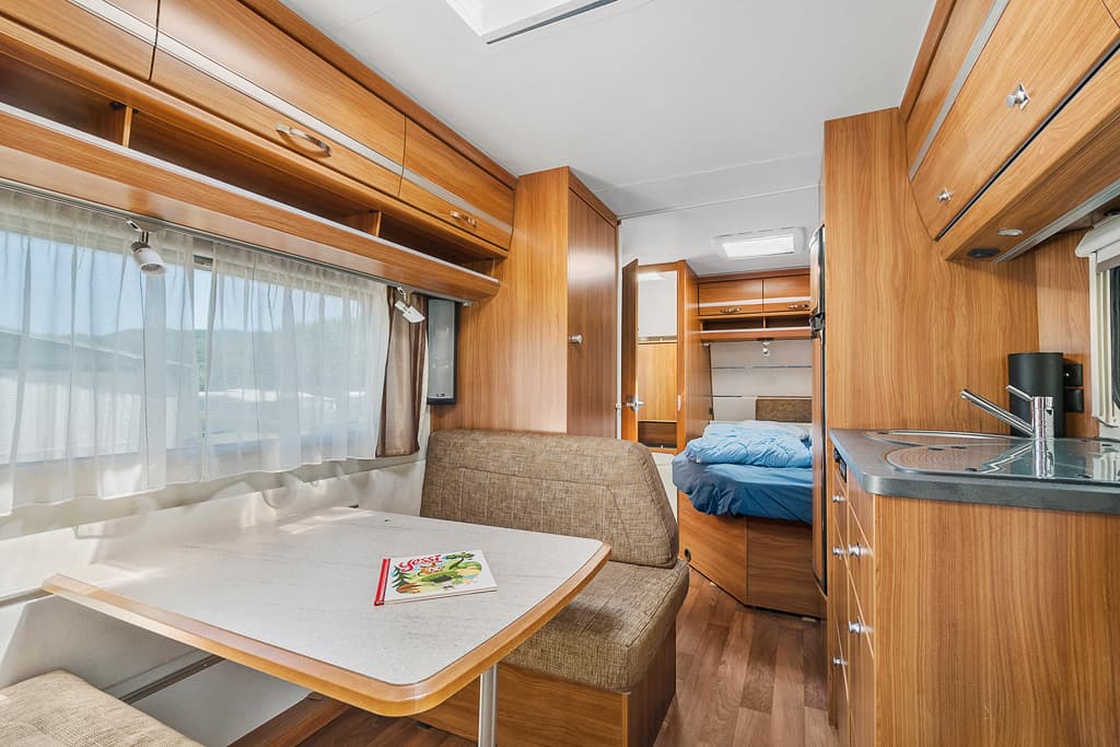 Binnen in de caravan