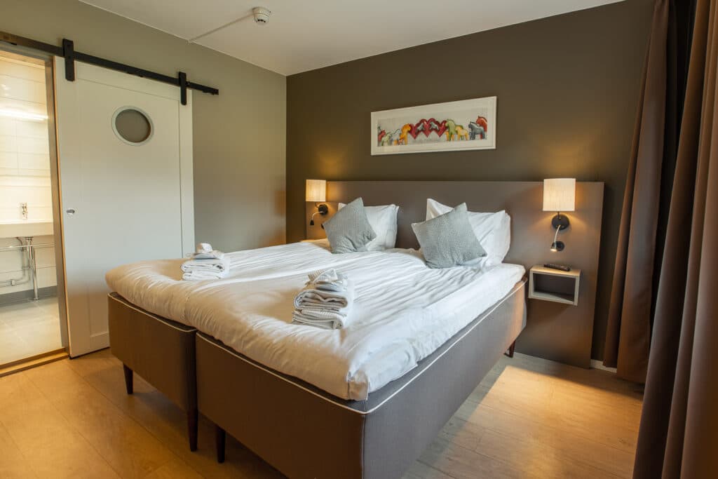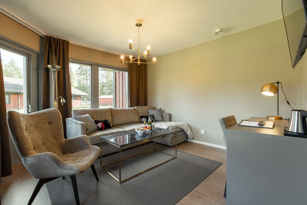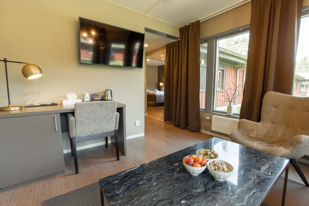 Welkom in onze suite van 35 m². De slaapkamer is voorzien van een comfortabel continentale bed van 180 cm en een tv. De woonkamer beschikt over een divanbank met een slaapmaat van 140 cm, een bureau, een tv en een minikoelkast. De badkamer is uitgerust met een toilet, ligbad en regendouche. Beschikbare tv-zenders: SVT1, SVT2, TV3, TV4, Kanal 5, TV6, Viasat Sport en Barnkanalen. Je hebt ook toegang tot de fitnessruimte, sauna en relaxruimte. Ontbijt, beddengoed en schoonmaak zijn inbegrepen.