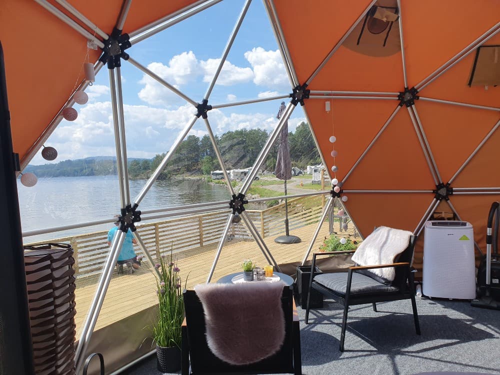 An experience you will never forget awaits you in our fantastic glamping domes, with panoramic views out over Lake Norsjø! This unique accommodation is perfect when you want to enjoy that little extra touch of luxury during your holiday. The glamping domes also have their very own 130 m² terrace, with a private bathing ladder leading down into the water. Start your day with a refreshing morning dip, and round it off with a relaxing evening swim as the sun goes down. The terrace is furnished with outdoor furniture and a barbecue grill for really enjoyable holiday living. Our glamping domes have room for up to four people, with a double bed and a sofa bed, and there is also a fridge/freezer and a coffee maker. You arrive to a made-up bed, and towels are also included in the price. You do not need to bring this with you. For a little extra luxury, washing of the glamping tents is also included.