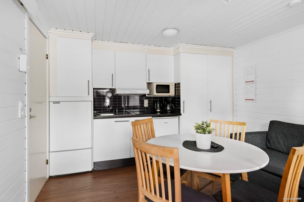 In the Northern Lights Cabin, your group can enjoy a relaxing vacation with all comforts just within reach. The cabins are 20 m² in size and accommodate up to four people with two bunk beds in the bedroom. Duvets and pillows are provided for all beds. The cabin features a kitchenette with a refrigerator, hotplates, and a microwave, as well as a dining area for four people and a TV. The bathroom is equipped with a shower and toilet. The furnished outdoor patio invites you to relax in the sun – perhaps with a good book and a refreshing drink. Parking is available next to the cabin.