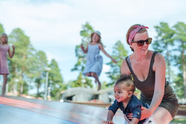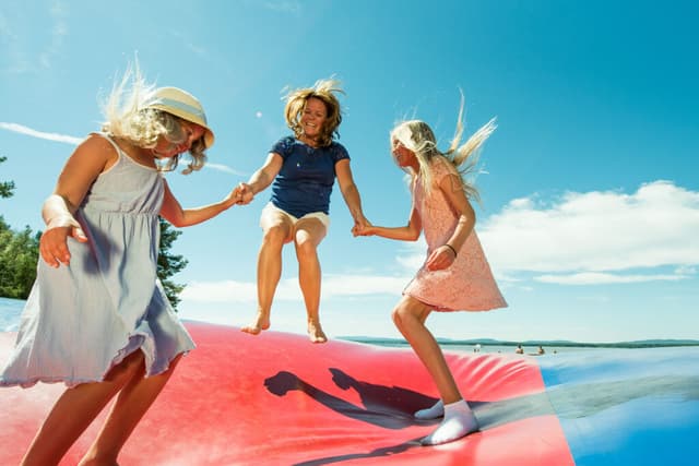 Probeer onze populaire springkussens! We hebben twee springkussens op onze camping: een kleinere bij de speeltuin onder het Kajutan Activity Centre en een grotere die prachtig ligt aan het strand van het Orsameer. Laat je kinderen springen en plezier maken terwijl jij achterover leunt en geniet van het mooie uitzicht over het meer en de warme zonnestralen.