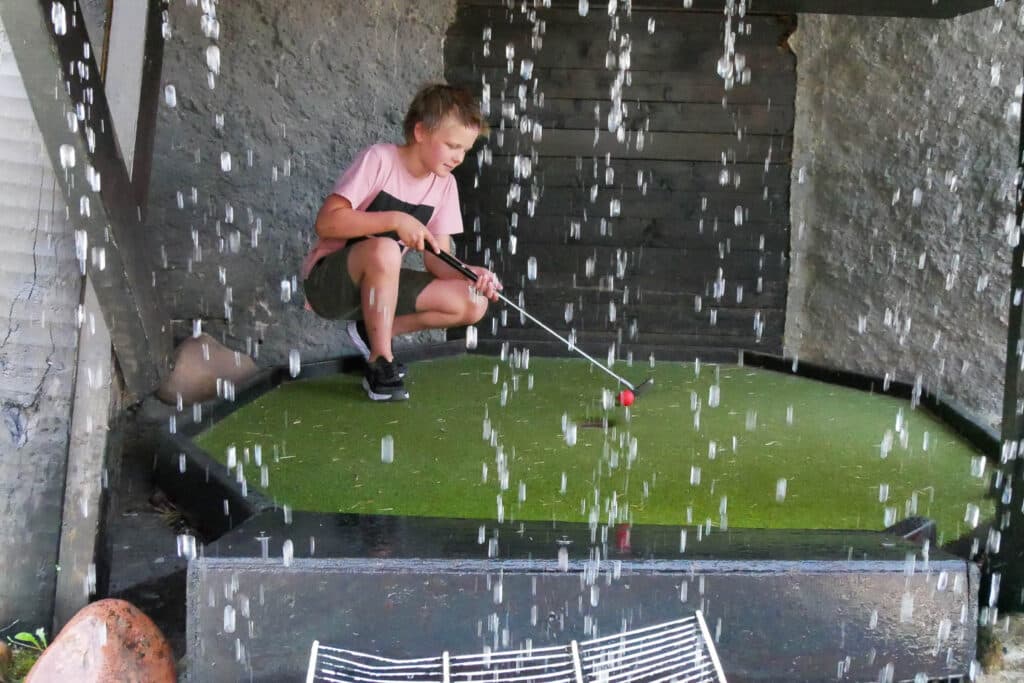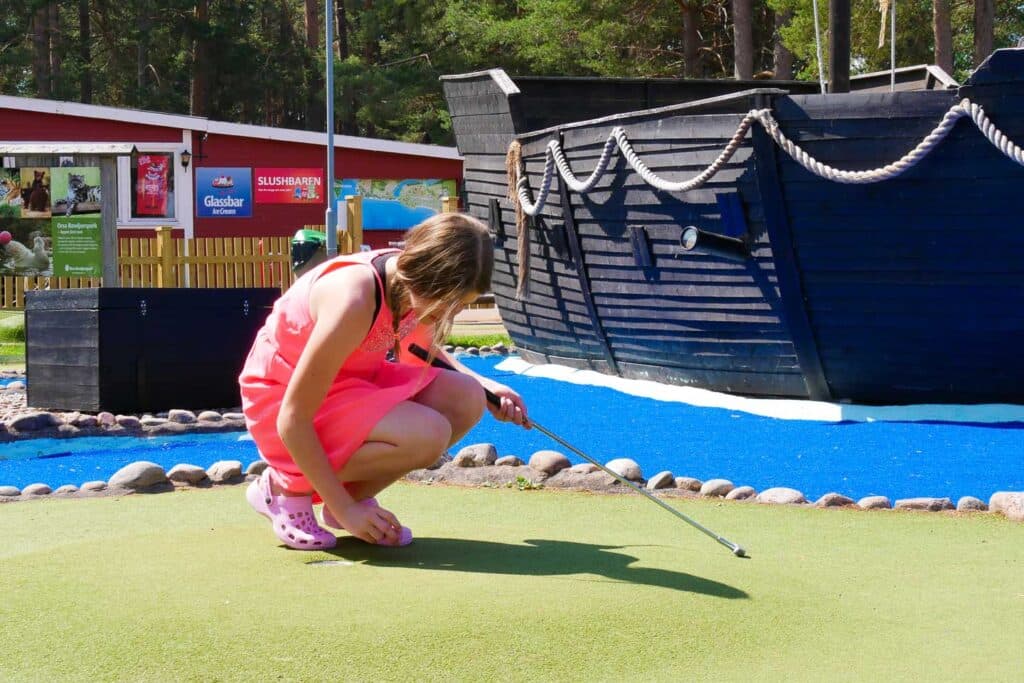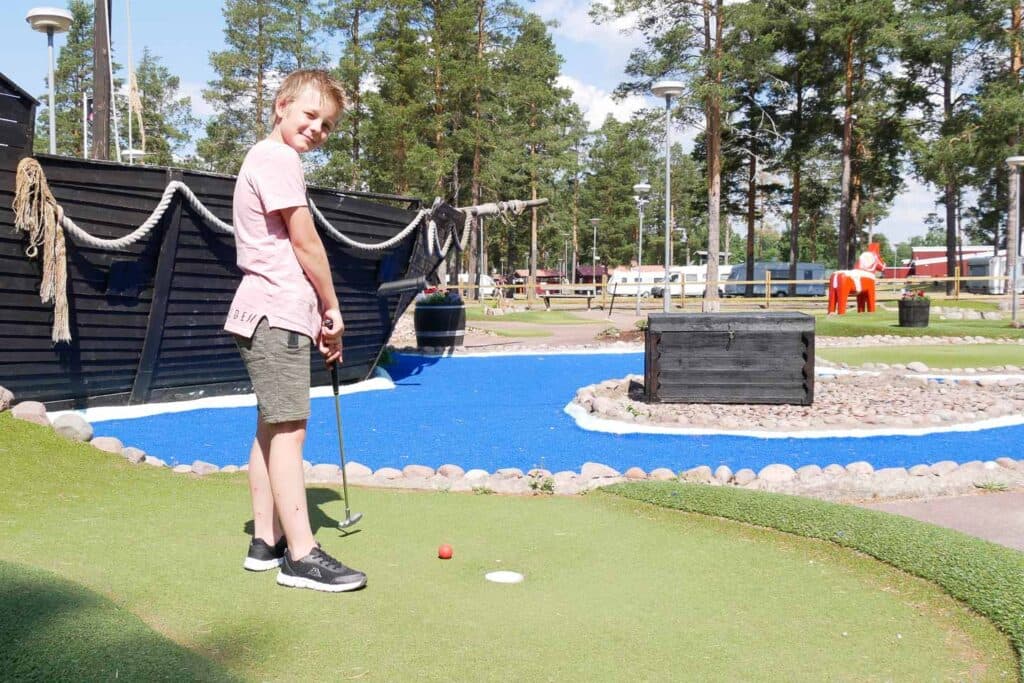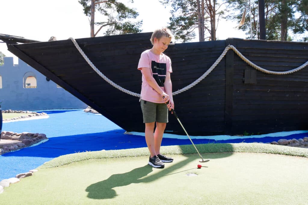 Onze spannende avonturengolf is een populaire activiteit voor onze gasten tijdens hun verblijf. Bepaal eens en voor altijd wie de kampioen van de familie is. Ga langs uitdagende hindernissen zoals een meiboom, een Dalahäst, een berenhol, piratenschepen, de finish van de Vasaloppet en een groot kasteel.