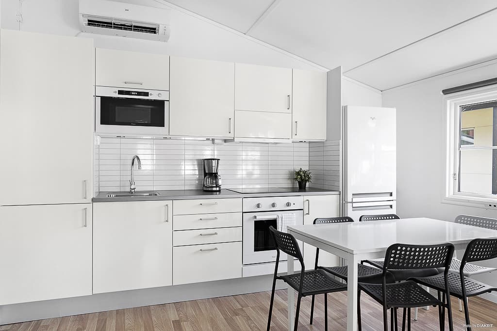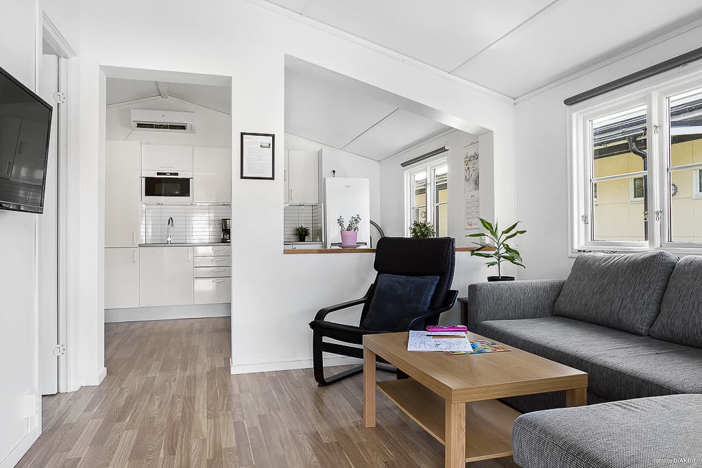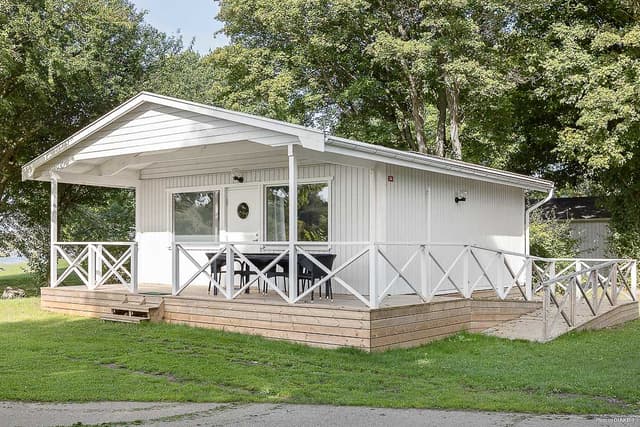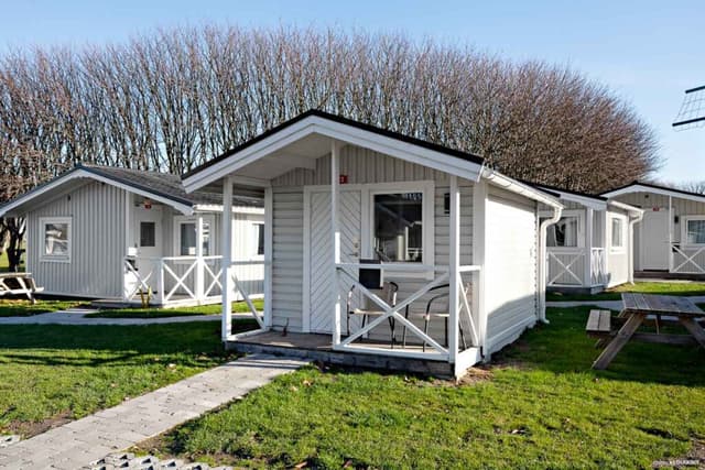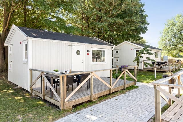 Ga voor extra comfort met een verblijf in onze op één na grootste stuga van 35 m². Öresundstuga biedt plaats aan zes personen en is licht en fris ingericht. De stuga beschikt over een ruime woonkamer met keuken en eethoek, evenals een gezellige zithoek met tv en een slaapbank voor twee personen. De keuken is uitgerust met koelkast, vriezer, magnetron, oven en kookplaat. Er zijn twee slaapkamers: één met een tweepersoonsbed en één met een stapelbed. Dekbedden en kussens zijn aanwezig voor alle bedden. De betegelde badkamer is voorzien van douche en toilet. Op het grote, gemeubileerde terras is volop ruimte om samen te ontspannen en te genieten van gezellige diners. Let op: het terras van stuga 23 is niet even groot als op de foto. Er zijn twee Öresundstuga-accommodaties op het terrein. Eén daarvan, nummer 34, is aangepast voor mindervaliden met een oprijplaat naar de voordeur, een brede toegangsdeur en een aangepaste badkamer. Deze stugor zijn niet huisdiervriendelijk.