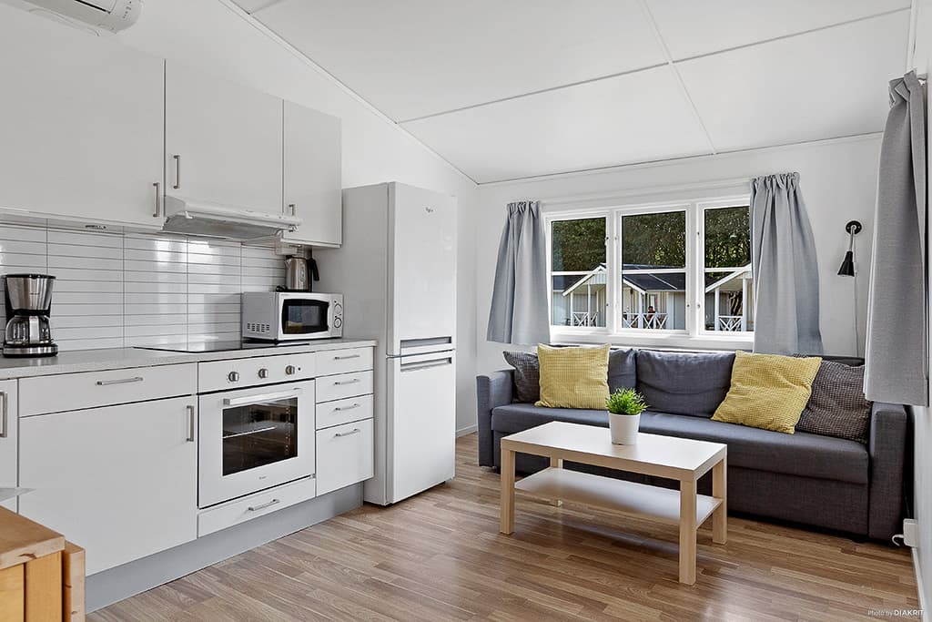 Sibbarpstuga is een comfortabele hut van 22 m² met alle voorzieningen die je je tijdens je verblijf kunt wensen. Op een steenworp afstand vind je de speeltuin, de winkel en de gezellige bistro van de camping.