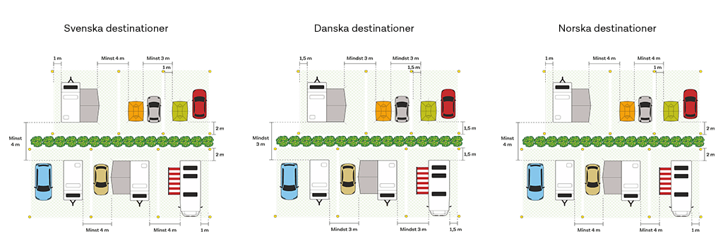 - Kampeervoertuigen moeten worden geplaatst op de gehuurde plaats en volgens de onderstaande afbeelding, in overeenstemming met de geldende brandveiligheidsvoorschriften (tenzij ter plaatse anders aangegeven). Twijfel je? Neem gerust contact op met ons team – we helpen je graag.